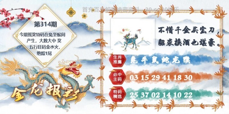 | 314期:绝杀两肖╠鼠+龙╣开:羊23中 |